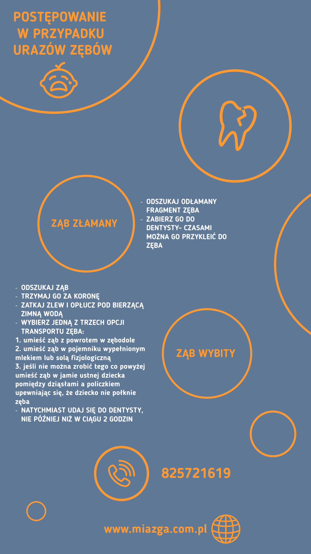 Urazy zębów w okresie dojrzewania są niemal wpisane w życie rodzinne. Wszelkie tego typu wypadki są bardzo emocjonalnym przeżyciem zarówno dla dzieci jak i opiekunów. Łatwo w takich chwilach stracić głowę i popełniać błędy, które utrudniają przyszłe leczenie. Przygotowaliśmy dla Państwa krótki poradnik dotyczący urazów zębów i prawidłowego postępowania w takich sytuacjach. Jest to o tyle ważne, że na rokowanie leczenia tego typu urazów, czas reakcji ma bardzo duże znaczenie. Poniższą ulotkę można wydrukować i umieścić w łatwo dostępnym miejscu- ma to na celu przyśpieszenie Państwa działania kiedy już dojdzie do urazu..