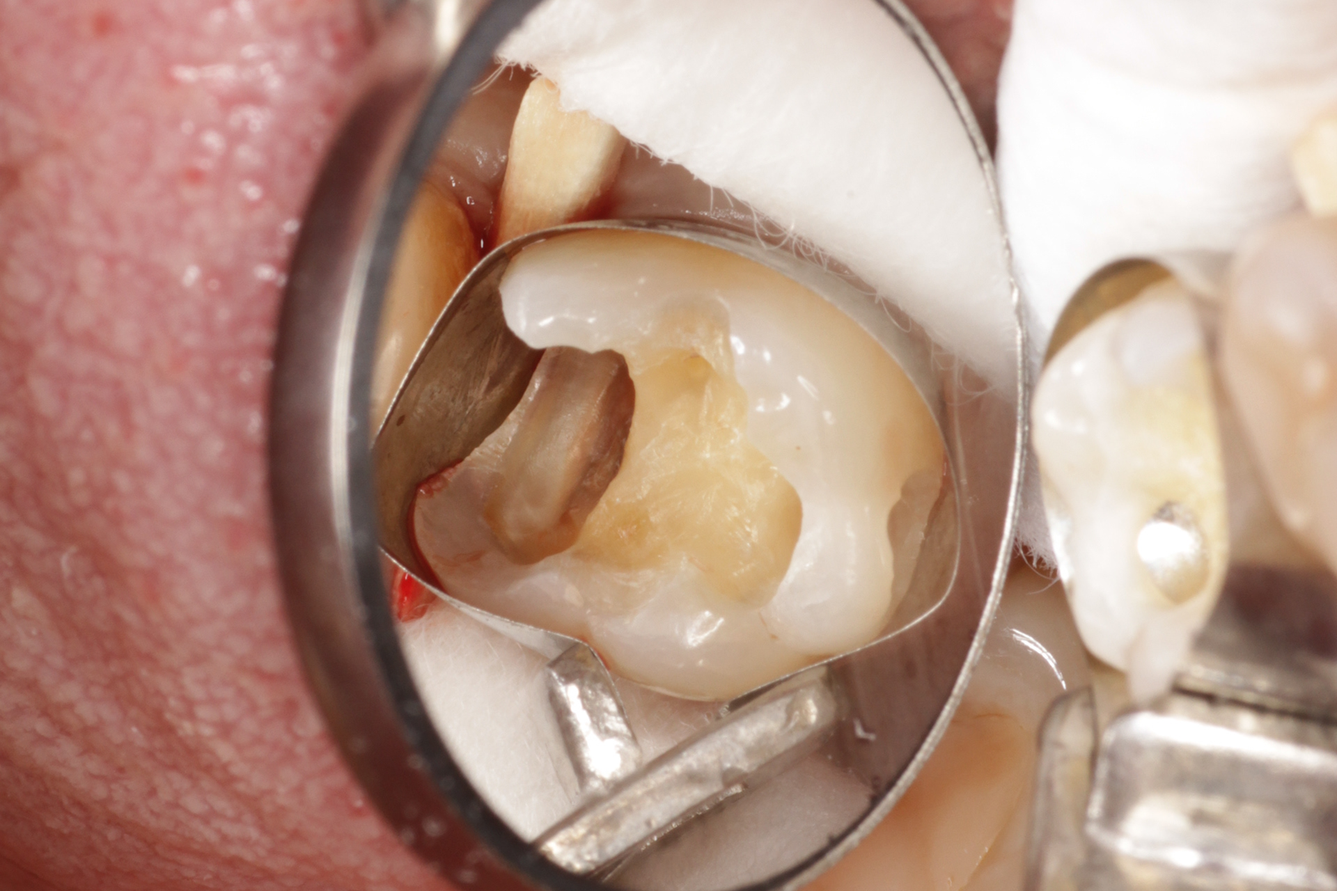 Leczenie pierwszego górnego przedtrzonowca- na powyższym przykładzie widać standardowe postępowanie, które składa się z wykrywania próchnicy, w tym przypadku wtórnej (pod starym wypełnieniem). Następnie robimy opracowanie ubytku chemo-mechaniczne- w tym celu używany jest wybarwiający wykrywacz próchnicy, aby mieć pewność, że będzie ona dokładnie usunięta (zdjęcie 2). Na 3 fotografii ząb jest już opracowany- gotowy do wypełnienia. Na 4 fotografii widać ważny etap formowania przyszłej plomby- blaszka musi ściśle przylegać do zęba aby zachować jego anatomię. Ostatnie zdjęcie przedstawia gotową pracę po opracowaniu i polerowaniu.